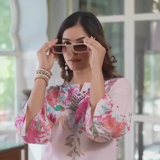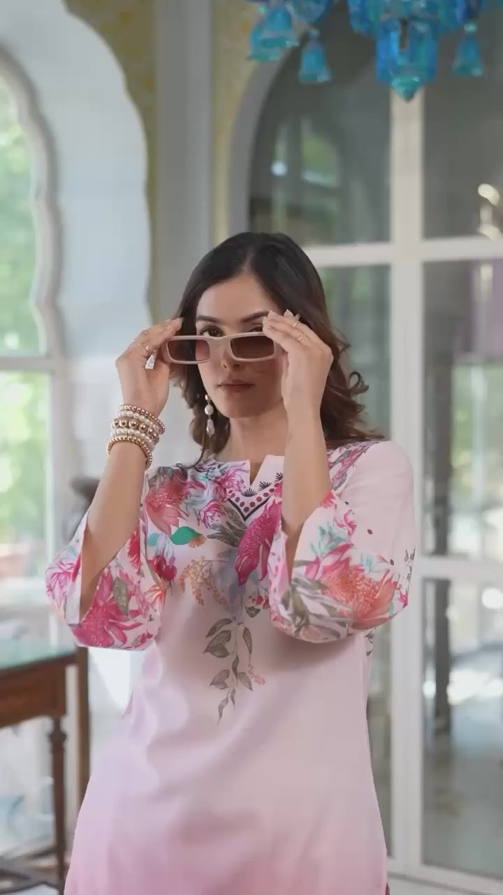 Effortlessly stylish and perfect for casual days out, this blush pink printed co-ord set is crafted from soft, breathable German rayon for all-day comfort. Featuring a relaxed silhouette with floral and geometric prints, the kurta comes with a scallop-inspired neckline and flared sleeves for a feminine touch. Paired with wide-leg bottoms bordered with intricate patterns, this set is your go-to for chic, easygoing fashion.